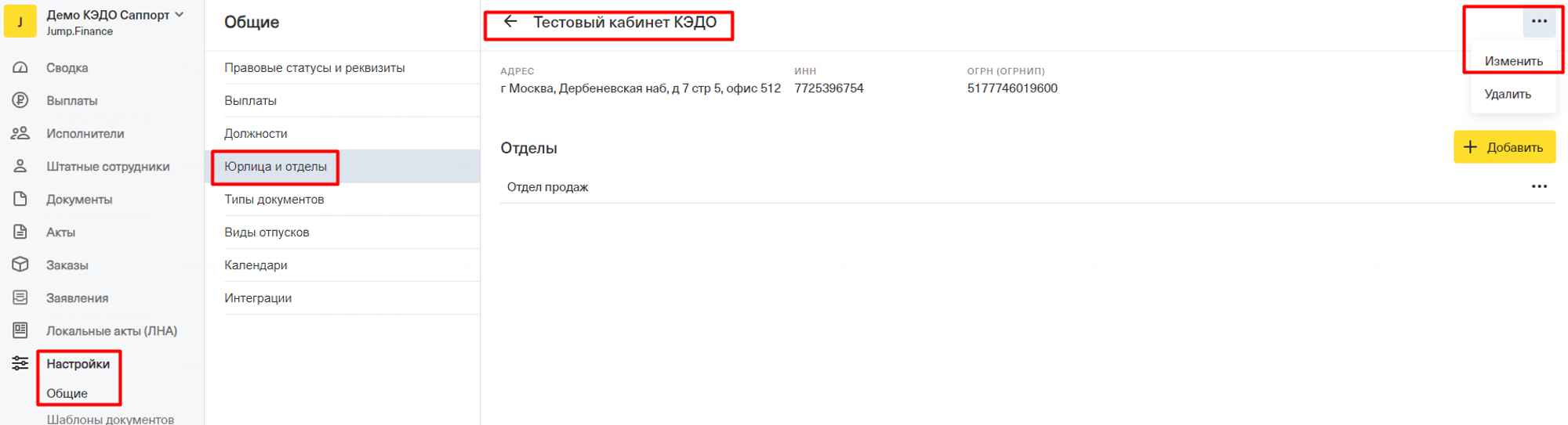 - Перейти во вкладку "Настройки/Общее/Юрлица и отделы"