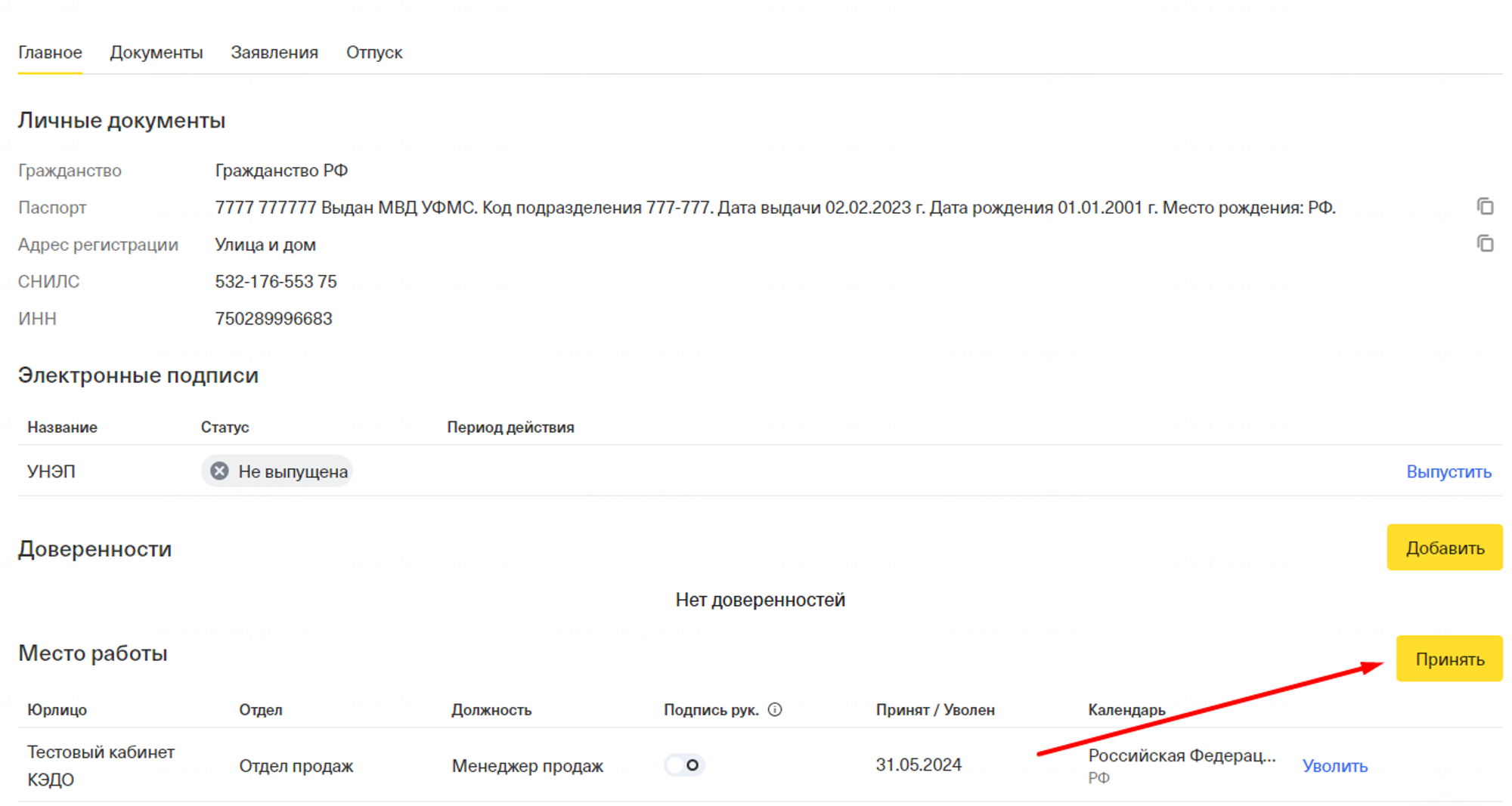 В карточке штатного сотрудника, отображается его контактная информация и личные данные. Во вкладке “Документы” и “Заявление”, соответственно, те документы, что направлены ему, и заявления, которые сам сотрудник подает.