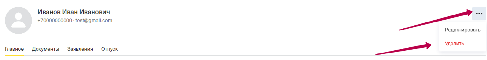 Далее в профиле сотрудника нажмите на три точки в верхнем правом углу экрана и “Удалить”.