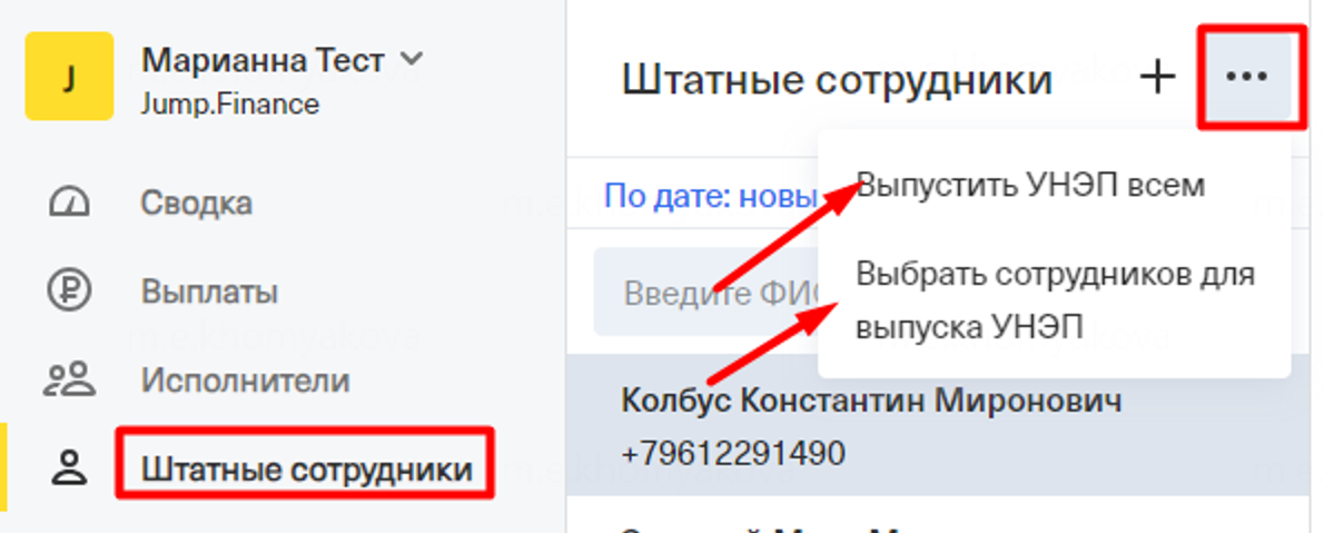 Перейдите во вкладку “Штатные сотрудники” и нажмите на три точки, выберете удобный для вас способ.