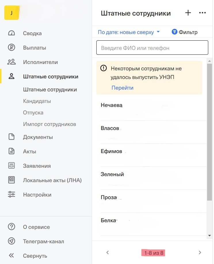В разделе “Штатные сотрудники” можно использовать фильтры для поиска необходимого сотрудника по ФИО или по статусам УНЭП.
