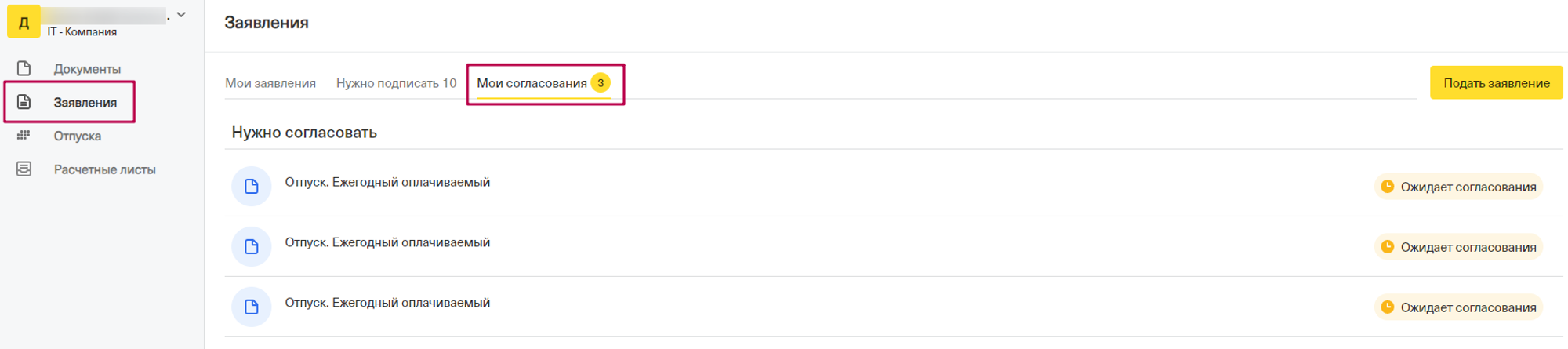 Для того чтобы согласовать заявления, а согласовывает, как ранее было сказано кадровый специалист, либо линейный руководитель, необходимо перейти в кабинет штатного сотрудника во вкладку “Заявления/Мои согласования”.