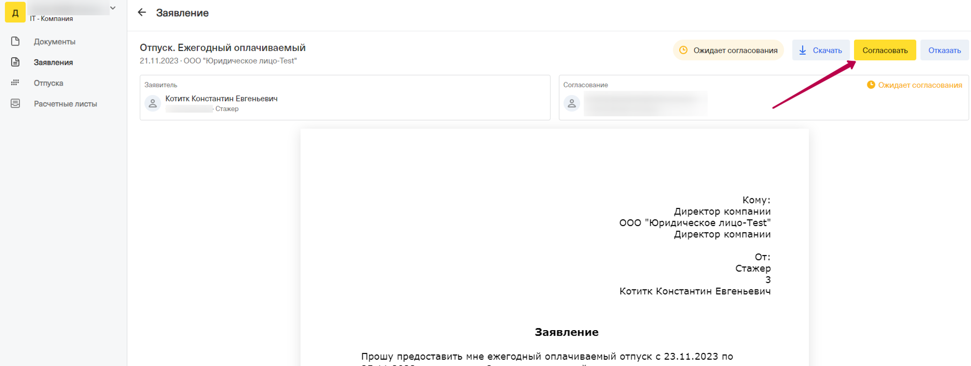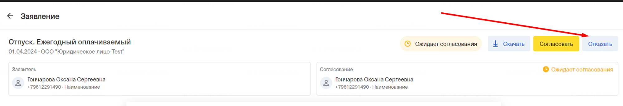 В том числе можно отказать в согласовании заявления, нажав на соответствующею кнопку “Отказать”,