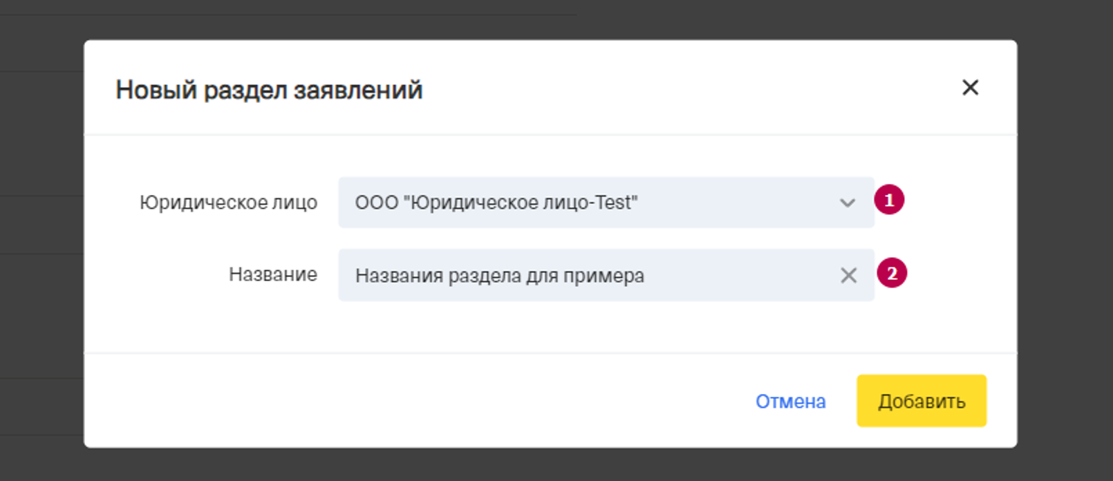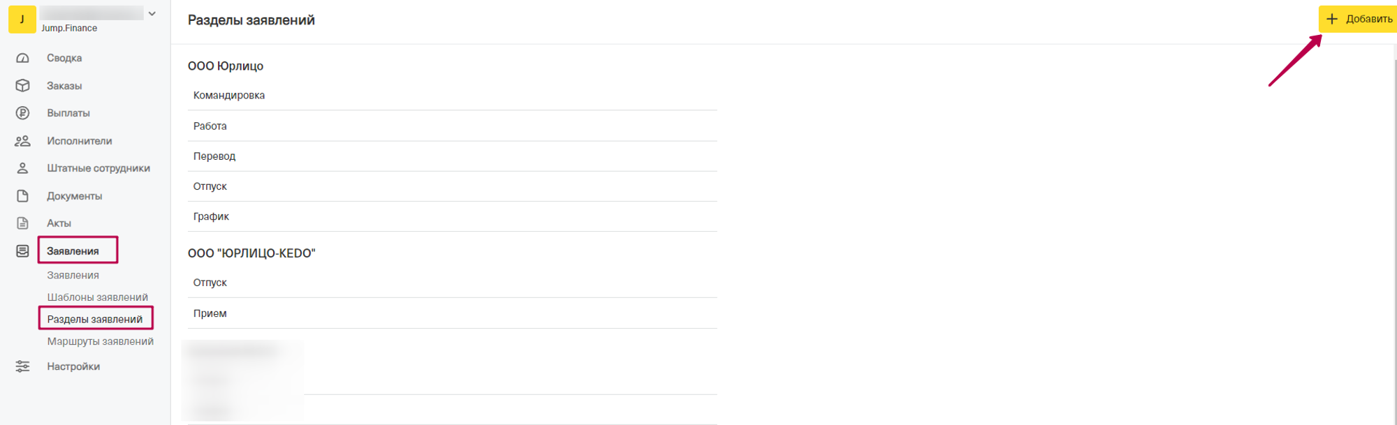 Для того чтобы добавить раздел, необходимо перейти во вкладку “Заявления-разделы заявлений” и нажать добавить.