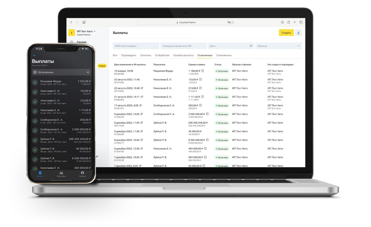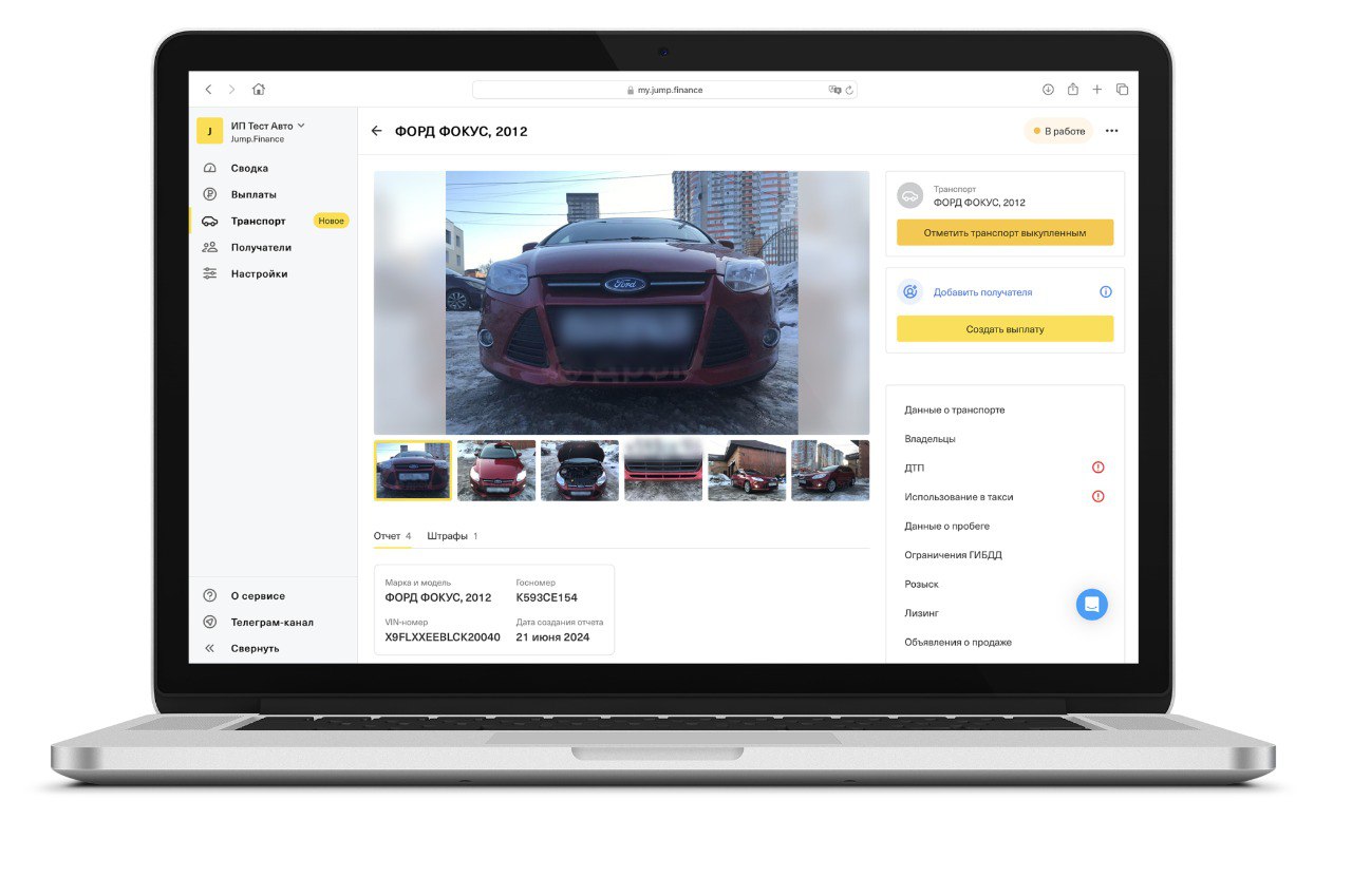 Jump позволяет проверить автомобиль и продавца перед выкупом и сразу провести выплату - как в личном кабинете на компьютере, так и в мобильном приложении, если сделка проводится не в салоне. Продавец получает деньги моментально: 24/7, без выходных, на карты любых российских банков. При каждой выплате формируется чек, который отправляется продавцу по СМС и сохраняется в личном кабинете. Также можно подгрузить и сохранить фото и сканы документов в карточке выплаты